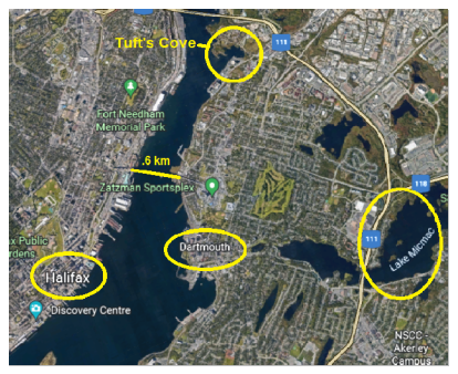 Contrary to popular trends in thinking, we can identify where Ice Hockey’s literal birth took place. Until evidence is provided that more strongly suggests an alternative view, it is most reasonable to assume the birth of ‘the stick game that became Ice Hockey’ must have occurred in the 5 by 4 mile area below. Most commonly known as Halifax, Nova Scotia, we again note that it is sometimes good to think of as Halifax-Dartmouth-Kjipuktuk in order to keep the focus on Halifax’s two other partners.