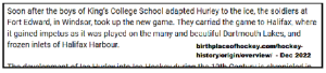 Since Dr. Vaughn is no longer able to explain his thinking, we must hazard a guess. If Ice Hockey was literally born on King’s College’s Long Pond, Fort Edwards becomes the most logical choice for being the closest military settlement to King’s College.