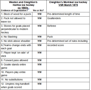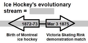 In order for a community, game, or innovation, et cetera, to rightfully earn a place in the true story of early Ice Hockey’s evolution, one must show how such an item (a) emerged from or merged with Halifax ice hockey prior to James Creighton’s departure in ca. 1872, or (b) how it emerged from or merged with Montreal ice hockey after Creighton moved there. The earliest such reference is the best measure of an item’s true introduction into Ice Hockey’s evolutionary stream.