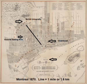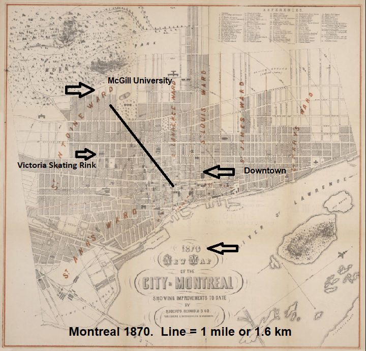 There would have been no need to involve everyone else when the sticks reached Montreal. Creighton had to have them before he could suggest a firm day and time when a group could gather, perhaps on a weekend day or holiday. As noted, the odds favour an outdoor birth for Montreal ice hockey, definitely in the neighbourhood where McGill University and the Victoria Skating Rink are, and quite possibly on the site where the Montreal Forum now stands.