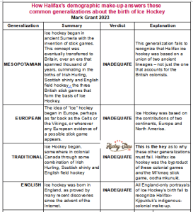 Since we don’t literally know how Halifax ice hockey was born, we must seek the best theory. Halifax’s situation is different than Windsor’s, where others claim that Ice Hockey was born through a single British stick game, Irish hurling. Given Halifax’s demography, our best theory says that ‘the stick game that became Ice Hockey’ was born through some combination of Irish hurling, Scottish shinty, English field hockey, and the Mi’kmaq ice game that we call oochamkunukt.