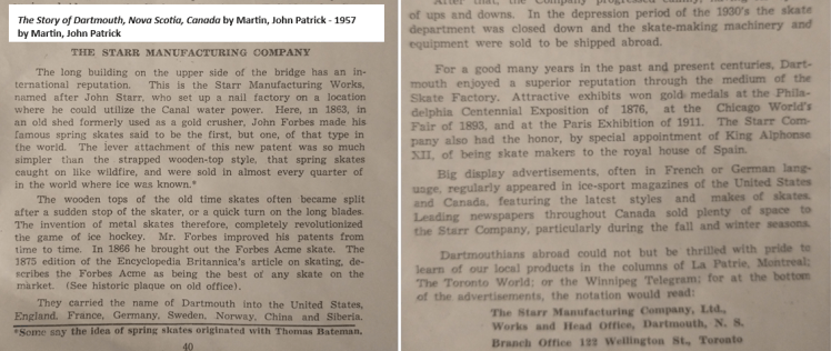 In order to understand the revolution that the Acme skate inspired, one must consider the world that surrounded Halifax-Dartmouth-Kjipuktuk before 1863. Since the 1500s skates were strapped to the user’s shoe or boot. Such skates clearly lack lateral (side-to-side) support. On page 59 of Hockey’s Home, Martin Jones quotes Dr. John Patrick Martin from The Story of Dartmouth, page 373: “By reducing the risk of having the wooden skate crack, the new Starr skate allowed skaters to take shorter quicker turns which meant that hockey could be played on smaller surfaces, such as indoor rinks.”